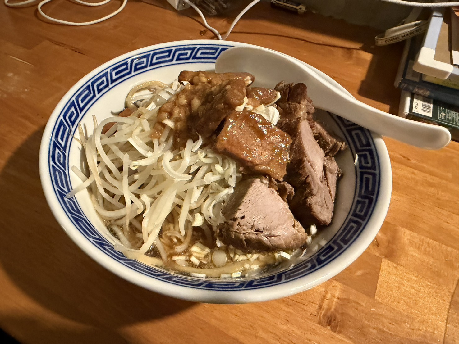 太麺 × もやし山盛り × チャーシュー のしっかり二郎系スタイル。